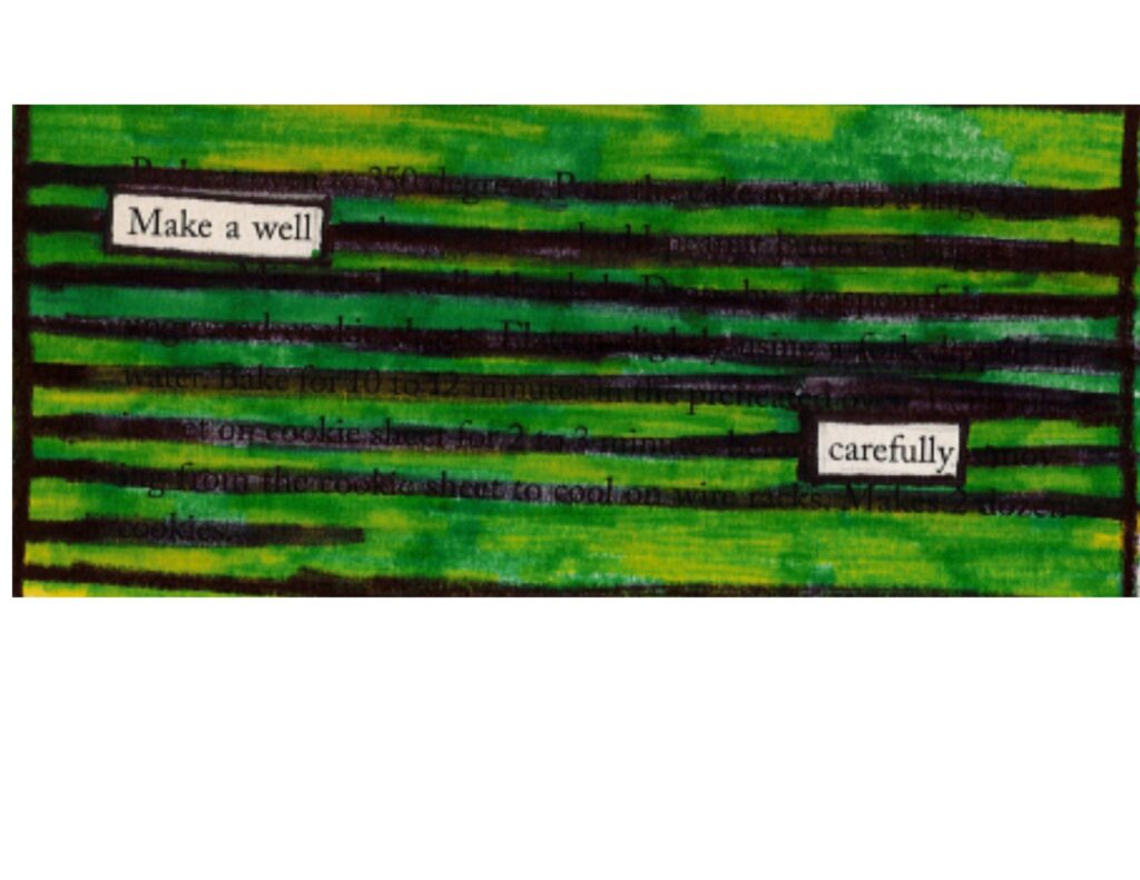 It can be fun, and you might discover something along the way. You might learn about your habits, what you steer toward, what you avoid. An erasure can be a reclamation of one’s freedom, a reinstatement of people erased from history. An erasure might just be relaxing. One motivation for me is to prevent a book from going into the trash, which, where I work, is common.